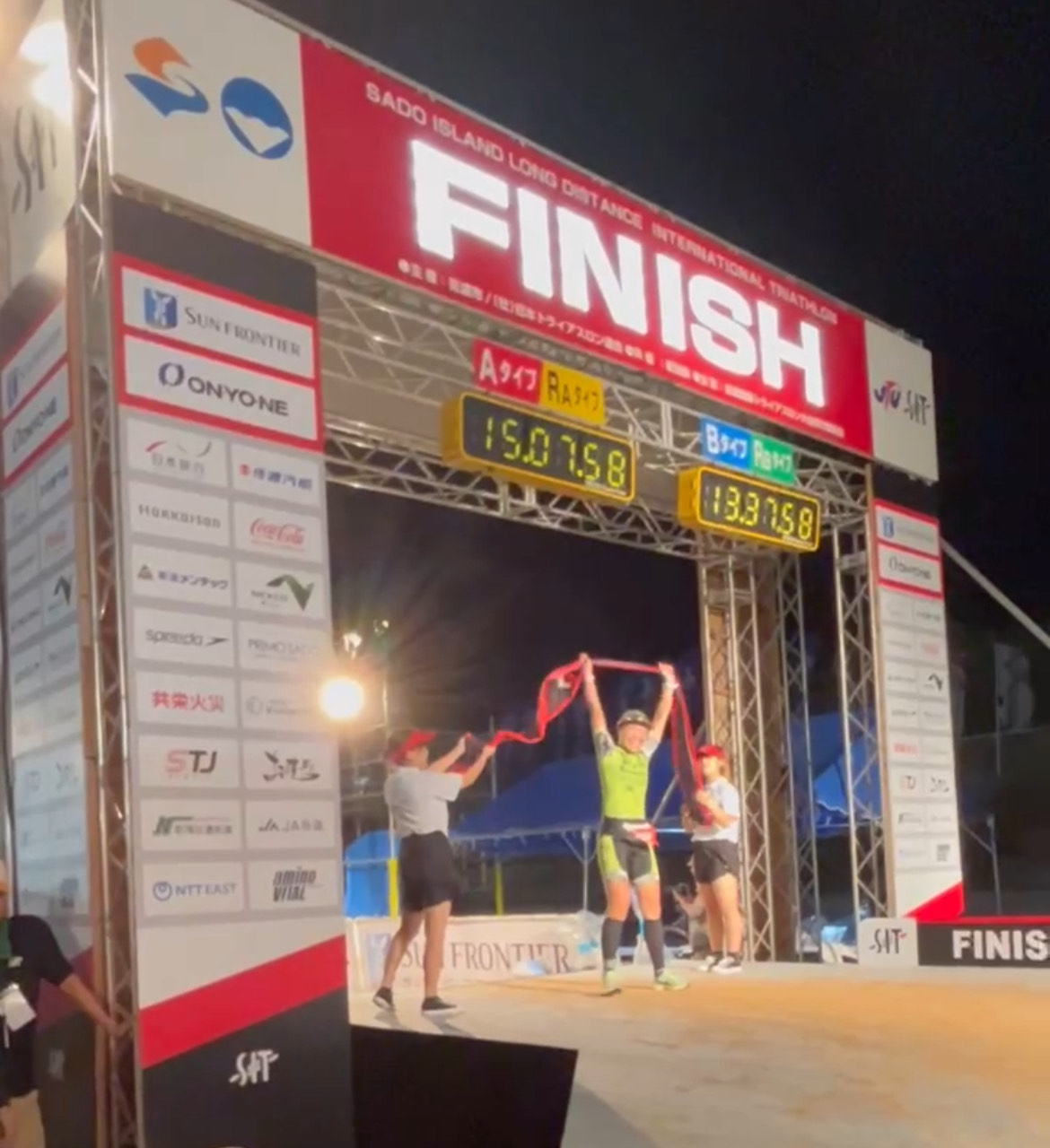 実は今年は過去イチ、コンディションが悪く・・すごい高波と強風。何十年もレースを重ねている達人仲間でもこんな荒れた海は初めてだと言ってたくらい。スイムが苦手は私はもうスタート前から泣きたかった。波で前が見えなくて流されまくり、かなり時間がかかって苦戦しましたが何とか泳ぎきったときはほっとしましたね😂バイクは佐渡1周。強風で進まずしんどかったですが今年はいっぱいバイクの練習したので楽しめる余裕がありました。何とか諦めずに最後まで走り切り、制限時間ギリギリの(いつもギリギリですけどねー)15時間7分でゴールすることができました😭